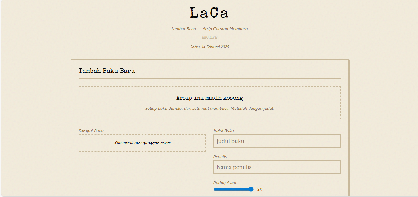 LaCa (Lembar Baca) adalah aplikasi web untuk mencatat pengalaman membaca buku — mulai dari reviu pribadi hingga timeline resume bacaan per sesi. Aplikasi ini dirancang dengan tampilan yang minimalis, menggunakan teknologi Vue.js dan Nuxt.js untuk memberikan pengalaman pengguna yang responsif dan interaktif. Melalui aplikasi ini, saya ingin membantu orang lain untuk lebih terorganisir dalam mencatat pengalaman membaca mereka dan berbagi pemikiran tentang buku yang mereka baca.